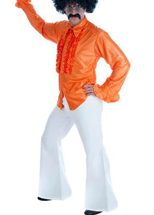 Adult size 1970s disco dirtbag bell bottoms style fancy dress mens white flared trousers with a crease down the front and button fastening with elasticated waist.