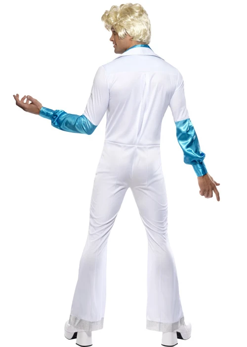 Adult size mens 1970s Abba style white disco man fancy dress costume, includes along sleeved white jumpsuit with flared trousers with an attached turquoise shirt.