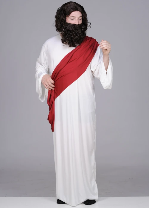 Adult size mens funny lads night out style Jesus fancy dress costume, includes a longth robe with a red drape.