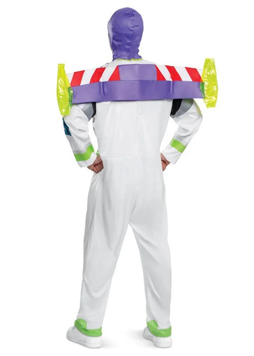 Adult size mens official Disney Pixar Toy Story character, this Buzz Lightyear fancy dress costume includes a white and green printed jumpsuit, jet pack and a purple fabric hood.