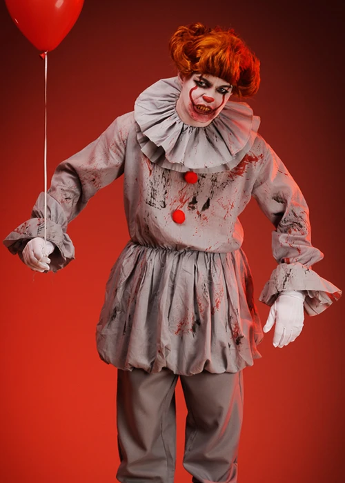A great value Halloween outfit inspired by the new It clown Pennywise, this killer clown costume includes a long grey tunic with attached red pom poms and fake blood splatters, grey ruffled collar neckpiece and wrist cuffs.