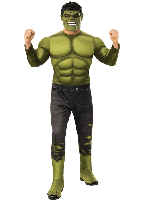 Adult size mens official Marvel The Avengers superhero character deluxe The Incredible Hulk fancy dress costume, includes a green printed padded muscle chest jumpsuit with shoe covers and a mask.