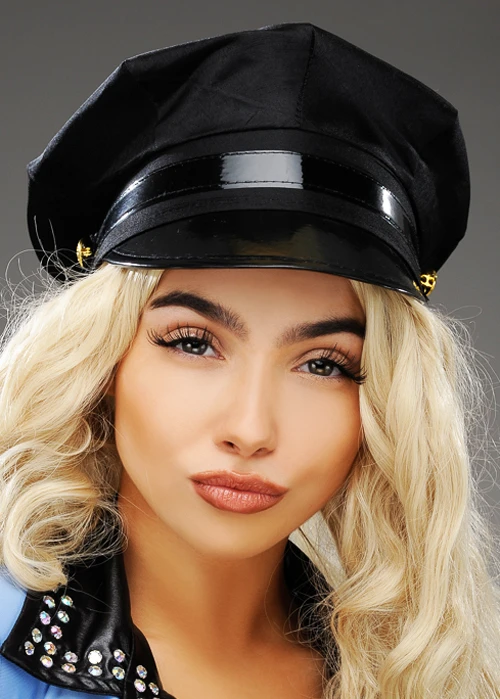 Adult size suitable for men and women cops and robbers police uniform style fancy dress accessory black fabric cop or chauffeur style peaked cap hat.