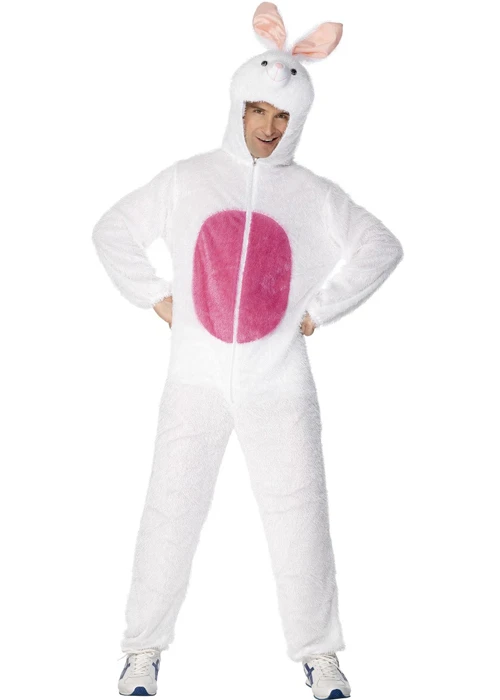 Adult size for men and women woodland animal style cute white bunny rabbit fancy dress costume, features an all in one zip up suit with a hooded headpiece.