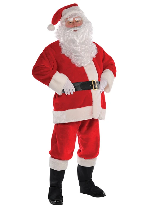 A great adult size Christmas regal Santa Claus costume, this Santa suit includes a bright red plush lined jacket with a white faux fur trim and zip front fastening, matching trousers with pockets, santa hat with pom pom, fake beard and wig set, black belt with buckle and boot tops.