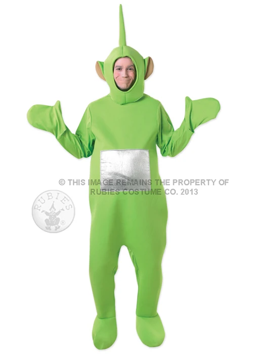 Adult size mens classic kids TV character official The Teletubbies Dipsy green teletubby fancy dress costume, includes a bright green bodysuit with an internal pouch for belly stuffing and a matching headpiece.