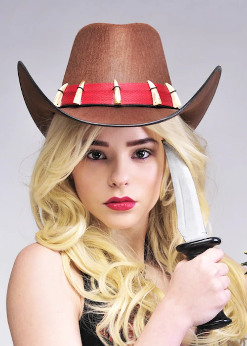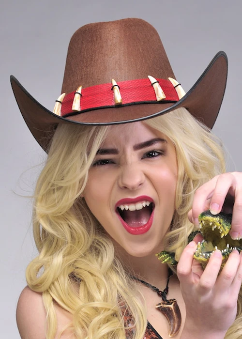 A fantastic accessory for an Australian crocodile hunter costume, this brown felt cowboy hat has a red band with fake crocodile tooth details, one size.