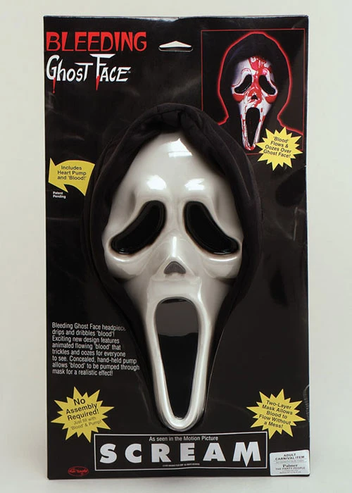 An incredible Scream Halloween mask! This unique product features a pump which allows the wearer to pump fake blood down the front of the mask! The blood is on the inside of the mask and so will not spill.