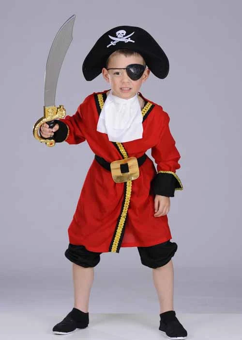 A great value childrens Pirate Captain costume that includes a red tunic shirt jacket, black fabric belt, black pants, pirate hat and white neck ruff.
