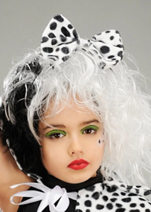 A fantastic accessory for a girls Cruella De Vil inspired outfit, this childrens size black and white dalmatian print hair bow comes on a headband for easy wear.