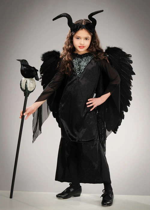 A gorgeous gothic fairytale book character for childrens. This Maleficent inspired wicked evil queen costume includes a long black velvet dress with feather trim and feature sleeves, large black feather wings on elasticated straps and black demon style horns on a headband.