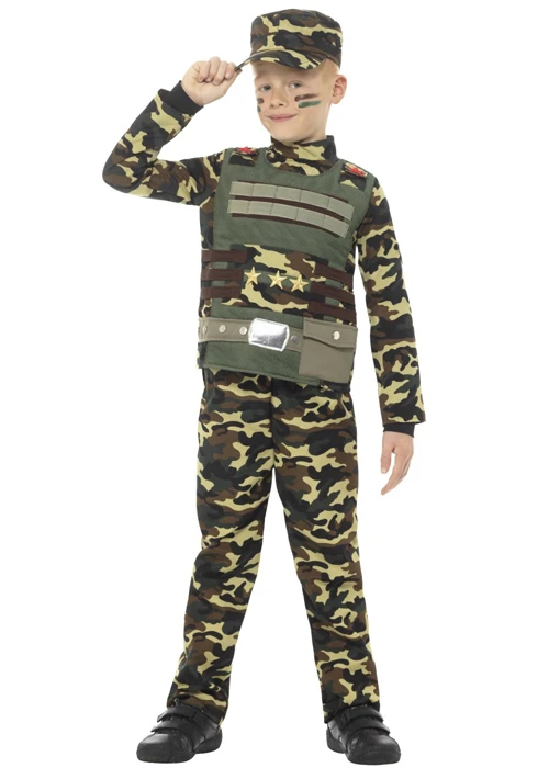 A great army uniform foir kids, this camouflage military boy costume includes a long sleeved top, matching camouflage trousers and hat.