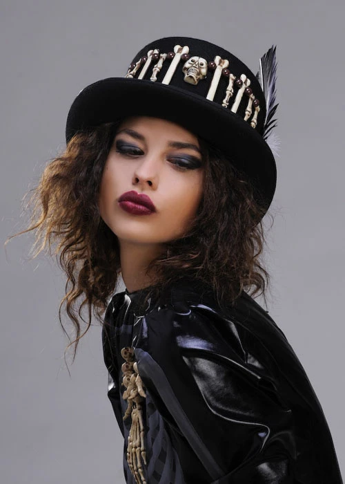 Our popular Voodoo witch doctor black felt top hat features a skeleton bone trim and feather details! One adult size.