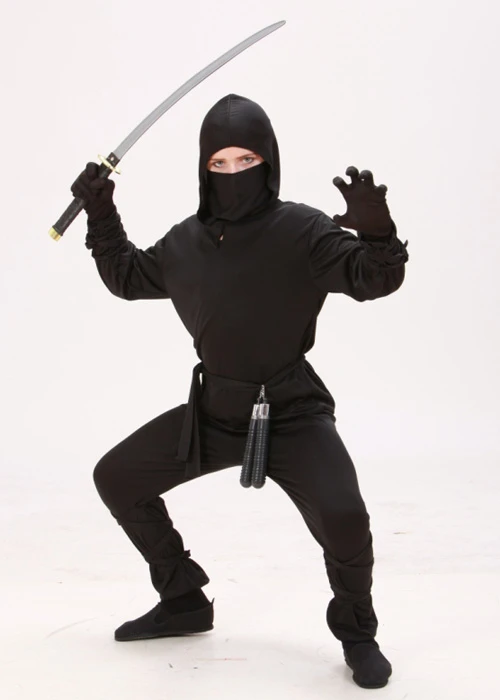 Childs size oriental style black ninja warrior fancy dress costume, includes a a black hooded coat, matching pants, tie waist belt, face mask, arm ties and leg ties.