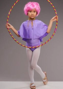 A cute outfit ideal for trapeze artist Anne Wheeler from The Greatest Showman, this childrens size costume includes a lilac lycra sleeveless leotard with a ruched detail on the bust, a matching short length lilac cape, white opaque tights and a gold beaded choker.