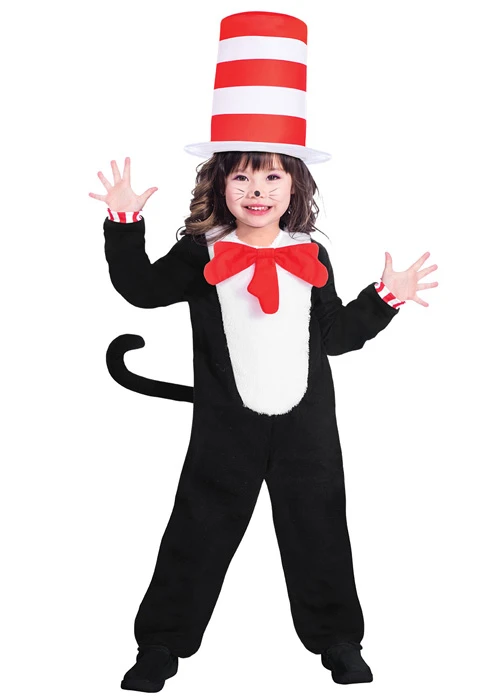 A classic book character from Dr Seuss, The Cat in The Hat costume includes a black and white cat jumpsuit with attached tail and red bow tie and a red and white striped top hat.