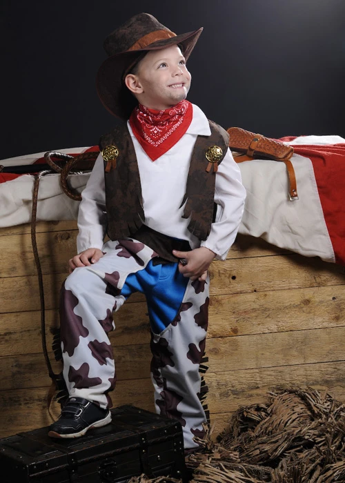 Childrens size boys western cowboy fancy dress costume, includes a pair of cow print chaps, brown cowboy waistcoat vest, red bandana and a brown fabric cowboy hat.