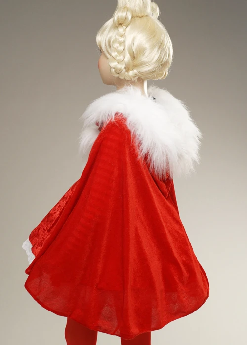 A girls size accesory for a Dr Seuss inspired Christmas outfit, this Cindy Lou style cape is made of red velour fabric and features a plush white fake fur trim. One childrens size.