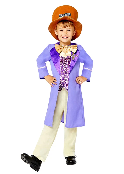 A fantastic boys Roald Dahl book character outfit this official Willy Wonka and The Chocolate Factory costume includes a long purple jacket with mock shirt front and brown top hat.
