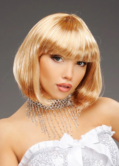 Adult size womens cute sexy fun 1920s charleston or flapper girl style fancy dress accessory short straight chin length bobbed dark honey blonde partyrama wig with a fringe, comes on an elasticated net to fit different sizes.