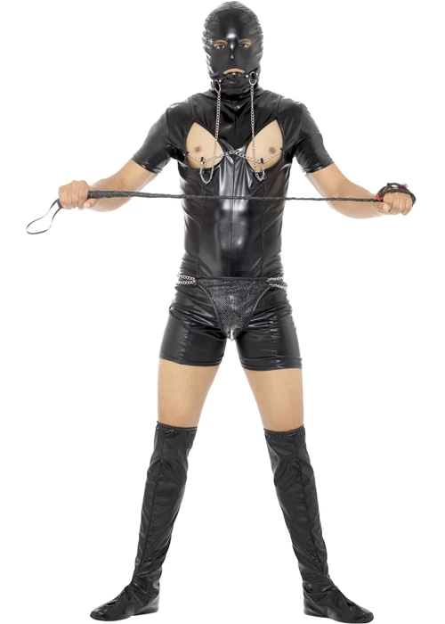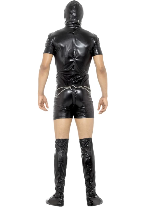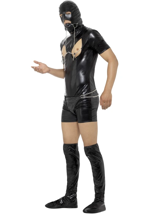 A fantastically embarrassing outfit that is perfect for a stag night, this bondage gimp costume includes a black wet look body suit, fabric hood mask, bootcovers, thong, gag and nipple clamps.