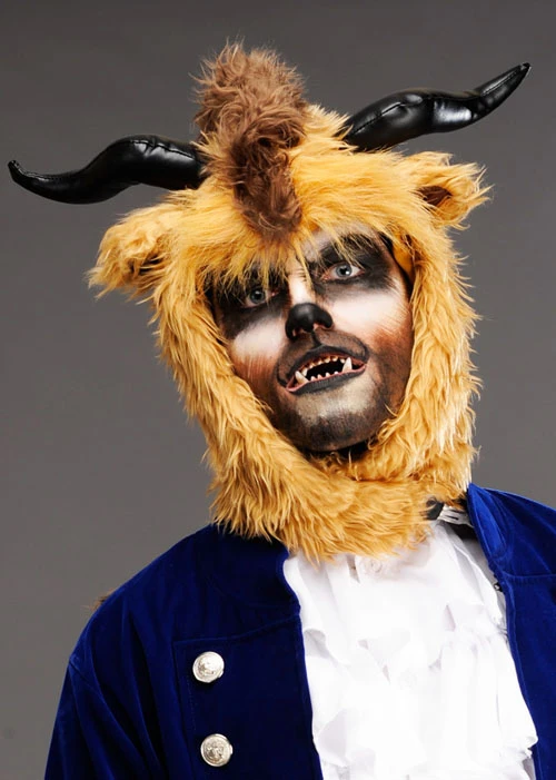 Adult size mens size fairytale Beauty and The Beast style fancy dress accessory brown faux fur fabric brutal beast hood headpiece with horns.