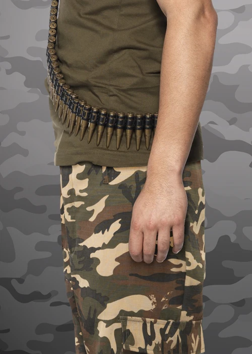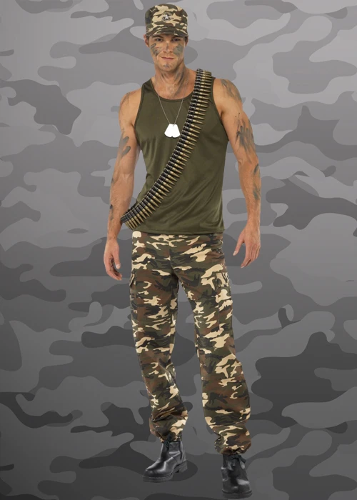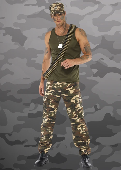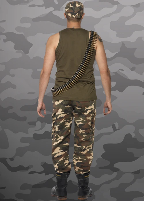 Adult size men’s military army action hero khaki camo fancy dress costume, includes a khaki green army style vest top and camouflage print trousers.