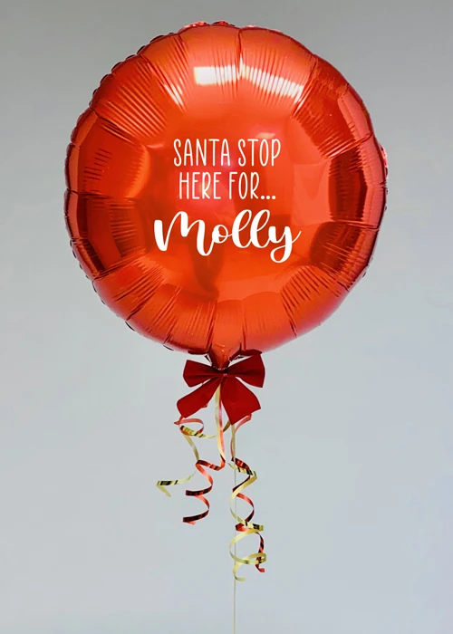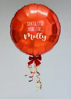 This cute fun customised balloon is perfect for Christmas, this round metallic red foil balloon comes complete with a personalised santa stop here message on one side and a red ribbon bow detail. This balloon comes fully inflated on a red foil balloon weight and will last for approximately 5 days from inflation.