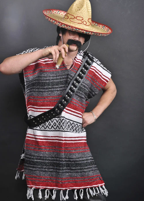 This amazing Mexican bandit costume features a red authentic looking fabric poncho top! Available in one standard size.