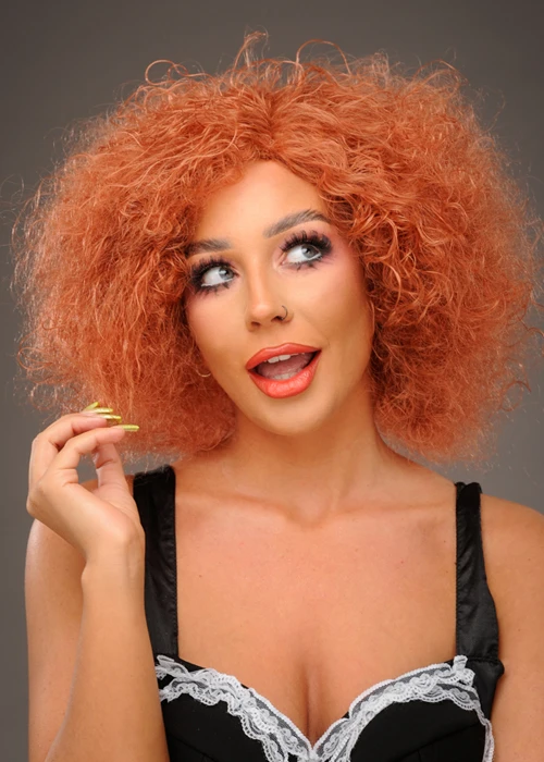 This wig is a fantastic accessory for a Rocky Horror inspired outfit, this big frizzy backcombed curly ginger wig comes on an elasticated net to fit different sizes. Please note does not include maid headpiece.
