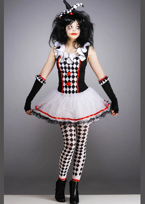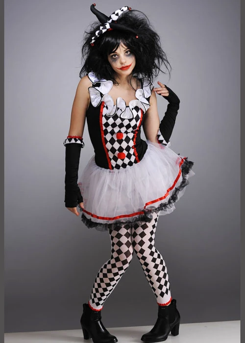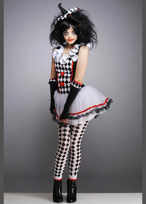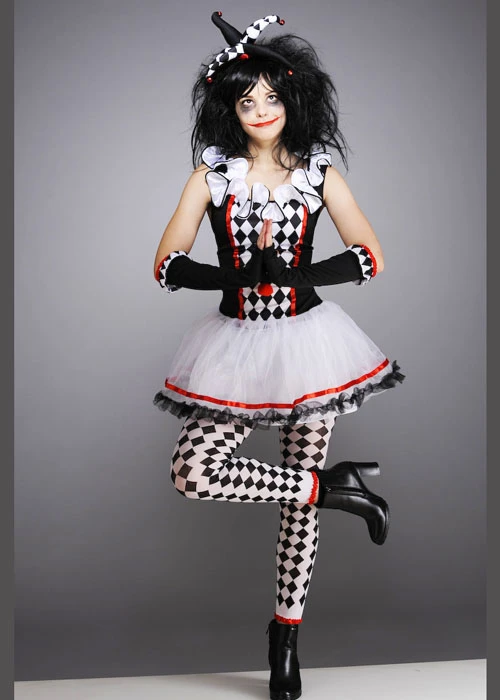 A beautiful and unique teen size gothic clown Halloween costume, available in a variety of sizes! Includes a black and white diamond pattern dress with tutu style skirt and attached neck ruff, jester headpiece on a headband, fingerless gloves and diamond pattern footless tights.
