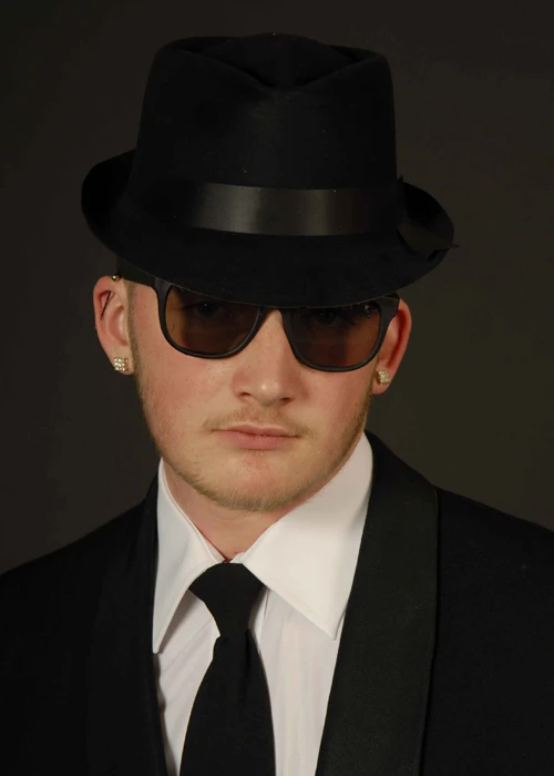 Adult size 80’s musicla movie characters Jake and Ellwood The Blues Brothers style fancy dress pork pie style hat, black plastic with a flocked finish.
