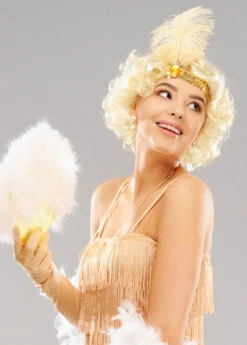A stunning accessory set for a 1920s flapper girl outfit, includes a gold sequin headband with jewel and feather detail and a pair of long length evening gloves.