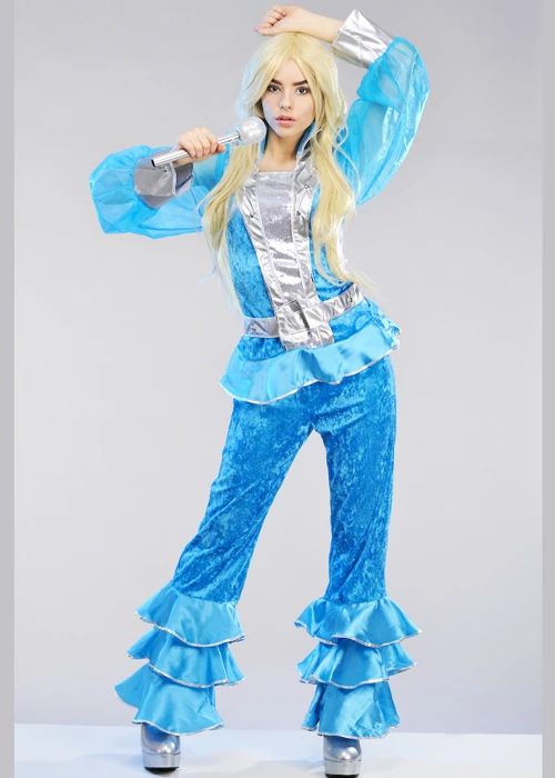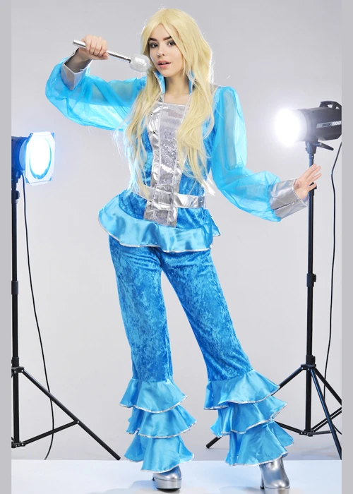 Adult ladies size cute fun 70s disco diva Abba style dancing queen fancy dress costume, includes turquoise blue and silver disco style top with sequin trim, matching turquoise flared trousers and a fabric belt.