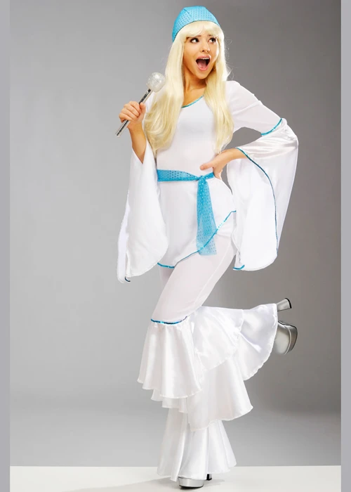 Adult womens size 1970s disco music icons Abba style super trooper fancy dress costume, includes a long length white seventies style top with a blue trim, matching white flared trousers, a blue sequin fabric waist tie and a matching sequin hat.