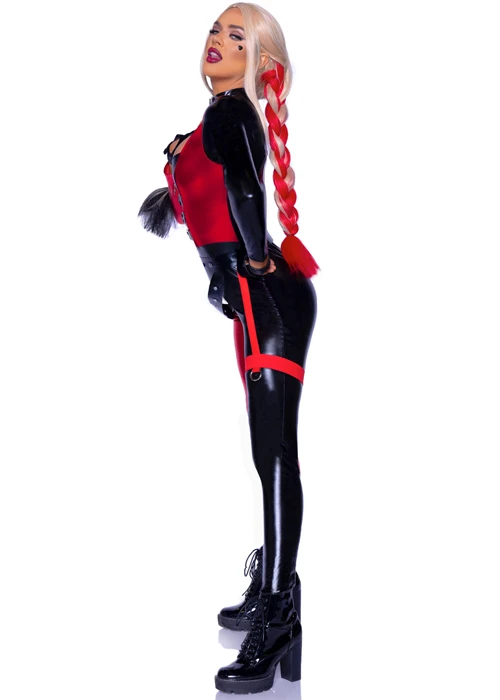 A fantastic Harley Quinn inspired outfit by Leg Avenue is perfect for Halloween, this Chaos Cutie costume includes a red and black two-tone zip up catsuit with buckle detail and belt with attached garter straps.