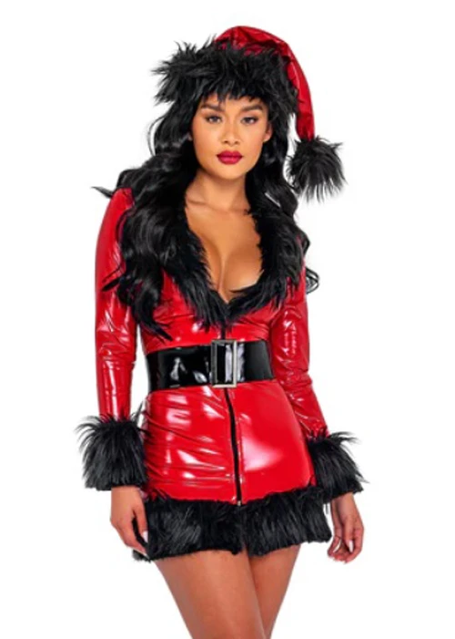A cute fun Miss Christmas outfit that is perfect for that Christmas party, this Santa Babe costume includes a short red vinyl dress with a black fake fur trim and a black belt. Please note does not include hat and boot covers.