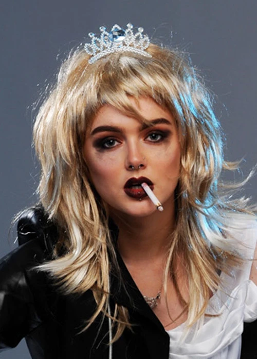 A 1990s rock music icon Courtney Love style wig, blonde straight feather cut layered wig with a fringe, comes on an elasticated net to fit different sizes.