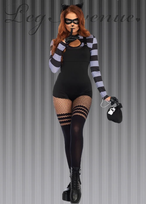 Adult ladies size cops and robbers cute fun cat burglar fancy dress costume, includes a black and grey striped romper jumpsuit with attached tail, black eye mask, cat ears on headband and money bag.