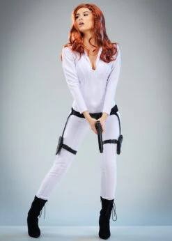A fantastic quality womens Black Widow from the Avengers inspired costume, this Black Ops Spy outfit features a white long sleeved catsuit and a black belt with leg holsters.