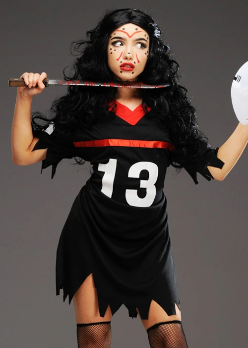 A fantastic Halloween costume for a Friday the 13th fan at a great price, this Jason hockey costume includes a black dress with a red trim and printed 13 design, plastic hockey mask and black fishnet stockings.
