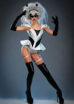 A fantastic scifi space themed cutie alien space girl costume that includes a metallic silver and black short length bodysuit romper with waist peplums and shoulder details.