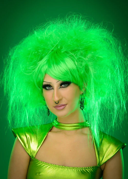 A fantastic accessory for a sci fi space alien girl costume, this bright neon green messy backcombed wig with a fringe comes on an elasticated size net for easy wear.