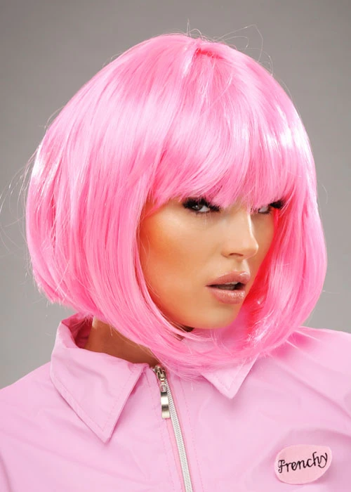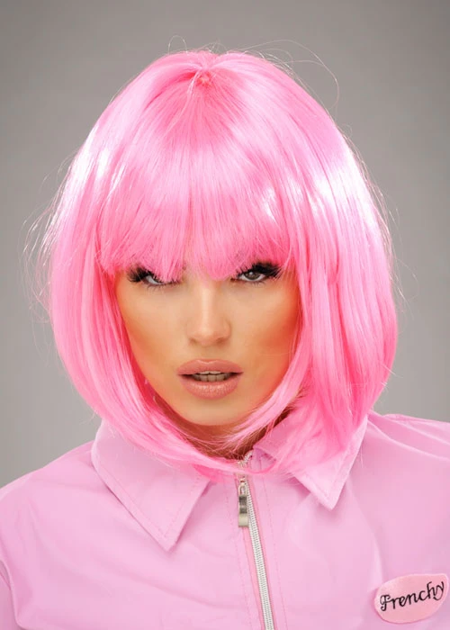 A fantastic The Pink Ladies from Grease inspired fancy dress accessory, this womens straight chin length pink bob wig with a fringe comes on an elasticated net to fit different sizes.